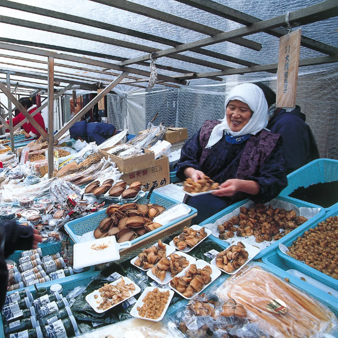 輪島の朝市は日本三大朝市の中でも最も歴史の古い朝市です。始まりは、神聖な場所である神社の境内で、祭礼日ごとに物々交換の市が立ったというもので、平安時代から千年の歴史をもっています。